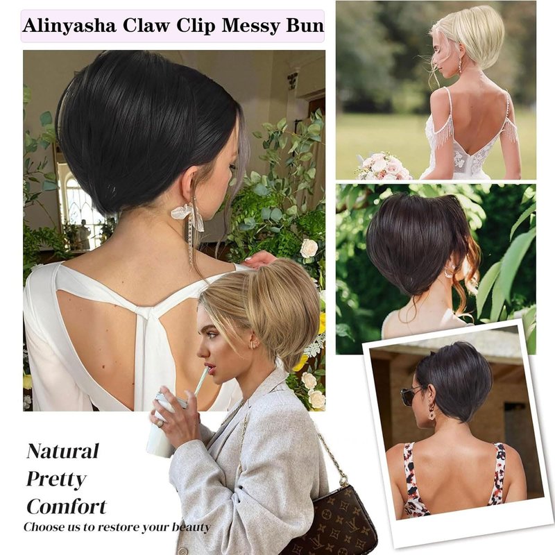- [Alinyasha Ponytail Bun]:Alinyasha claw clip ponytail bun hair piece blends flexible metal wire hair accessories with claw clips to create a stylish ponytail and hair bun look. Straight bun hair piece is made of high quality heat-resistant synthetic fiber,soft-touch, bouncy, more hair and more Invisible. 8-tooth claw clip , weighs about 3.5 ounces.