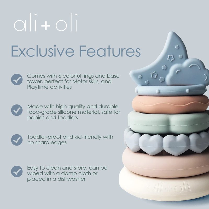 Ali+Oli Stacking Rings are a great way to help your baby's development, motor skills, and coordination. Our stacking toys for babies are made from 100% soft food-grade silicone. We use quality and durable materials that are BPA, Phthalate, Lead, Cadmium, and PVC Free. These soft baby toys are also great for teething babies who need something to chew on while they develop their teeth. Each ring has a cute design and an adorable moon and cloud topper. These stacking rings are also easy to clean. The stackable rings are dishwasher safe, or you can simply rinse them with warm soapy water before use. Our unique stacking ring toy is great as a baby shower gift for the mom-to-be! Our stacking toy offers endless opportunities for creativity and engagement, which makes it a baby gift for any new parent! Be part of a toddler's development with these stacking rings, and watch as they learn to stack, sort, and match!
