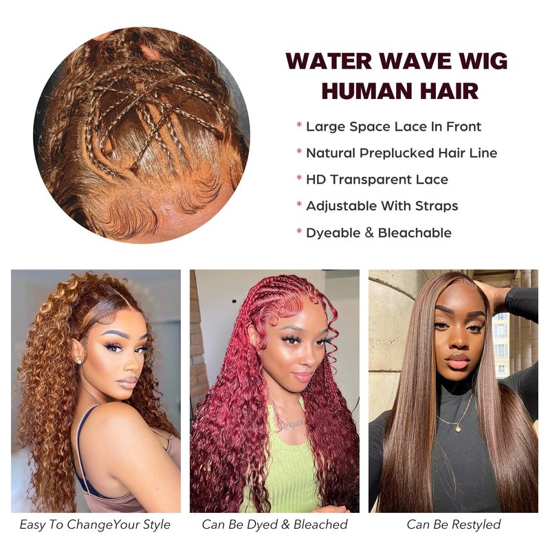 - 【Chocolate Brown Human Hair Wig Suit for Any Occasion】: Brown water wave Wig, 4# Color, New Trendiest Color,Can Be Used At Workplace, Appointments, Weddings, Cosplay, Theme Parties, School and Any Other Occasion. Magically Help You Become Fashion,Elegant and Attractive in Seconds.