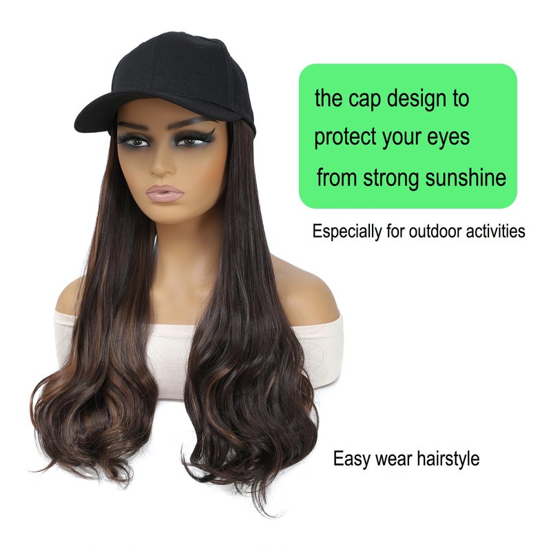 - 1. Specification and Material: Baseball Hat with straight roots wavy ends hair is made of high quality synthetic fiber and Cotton Baseball Cap. The cap is breathable. The Hair Extensions is sewed well in the hat by professional workers. The hair is super soft
