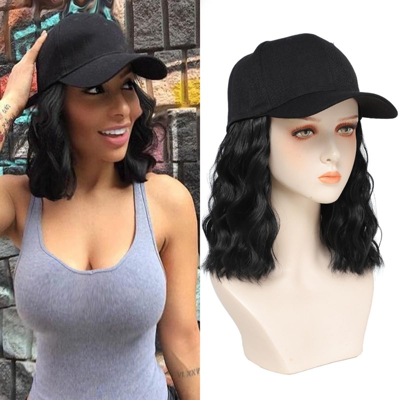 AliRobam Hat with Natural Wave hair Extensions attached for woman Baseball cap wig Short Bob Hairstyle Adjustable Wig (Black)
