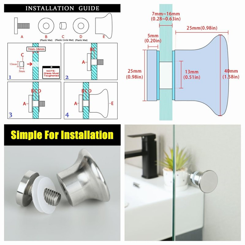 SpecificatIonsMaterial: SUS304 Stainless SteelFinish :Brushed NickelPackage Includes:Glass door knobUnique Groove Design,convenient and comfortable to gripHeavy duty solid metalNo hardware is required and it takes just a few seconds to installApplicable to all kinds of Bathroom shower room glass door, cabinet door, sliding door, French doors, etc