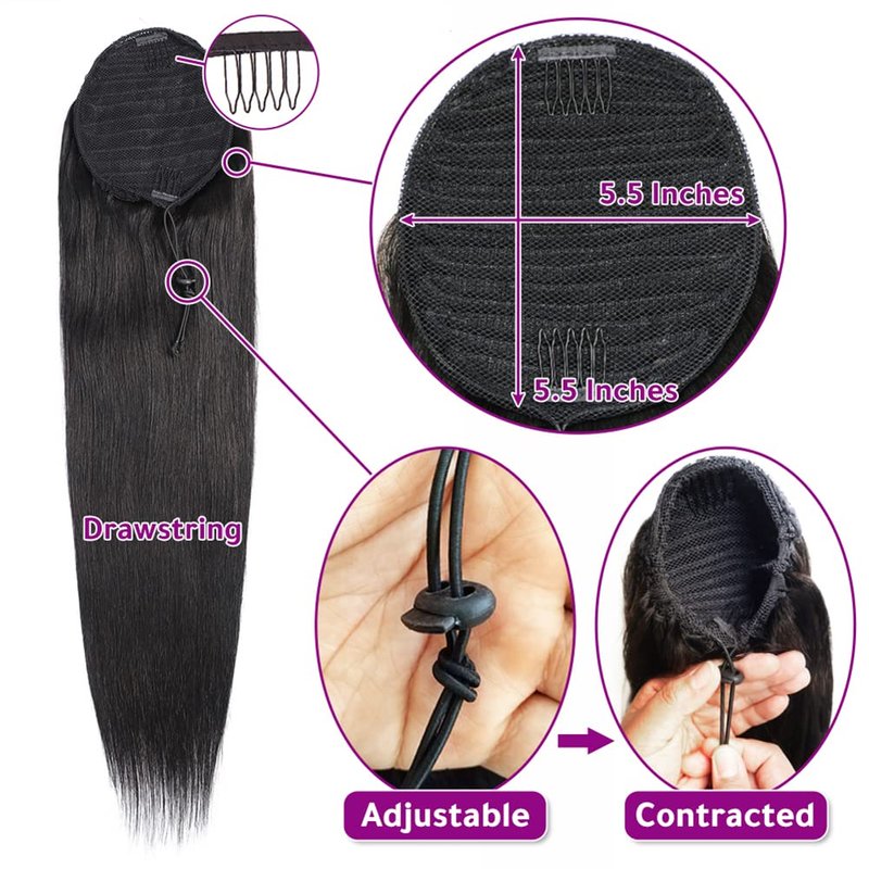 - 【Ponytail Specification】- Alisfeel human hair drawstring ponytail extensions is 100-130g per set according to the length. The net is soft and sturdy, the size is 5*5 inches. Hair color is natural black without chemical treatment. Please note that the nominal length is the size after straightening.