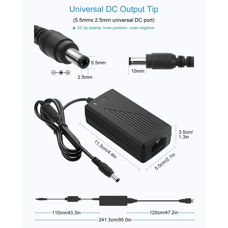 - Input: 100V-240V 50/60Hz; Output: DC 12V 5A max; Output adaptor jack size: 5.5mm x 2.5mm,compatible with 5.5mm x 2.1mm