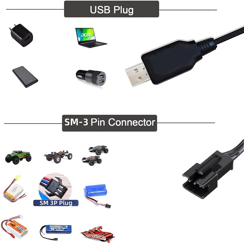 - Compatibility: This LiPo battery USB charger is specifically designed for 7.4V LiPo batteries and comes equipped with an SM-3 PIN PLUG. Please refer to the Product Details page image to confirm the connector plug models before placing an order.