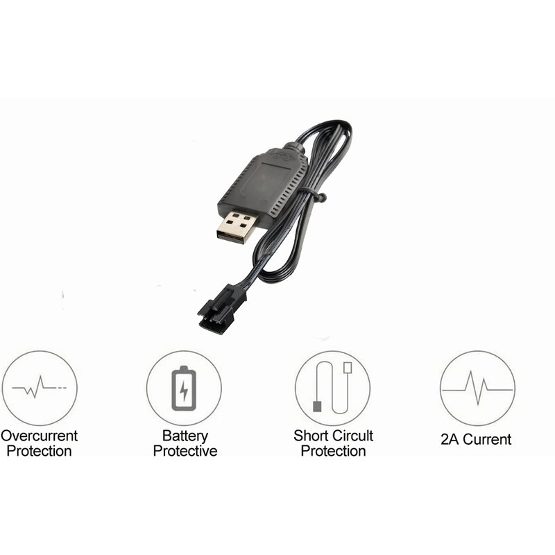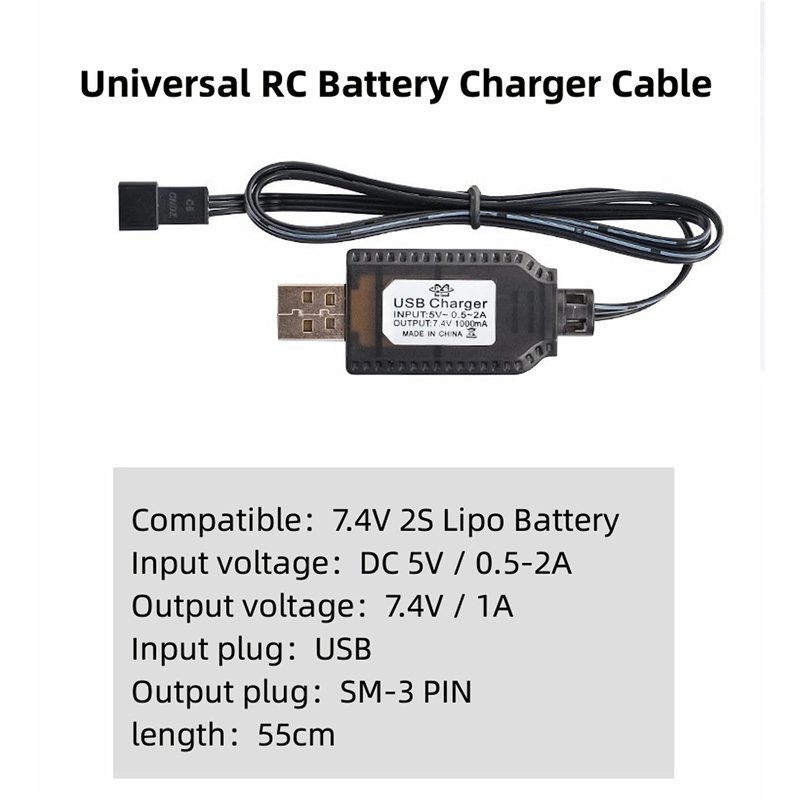 - Safe Charging: The 2s battery charging cable has over-voltage, overload, and short-circuit protection functions. Before use, please ensure that the voltage (7.4V) is compatible. The input is DC 5V 2A, output is 7.4V 1000mAh, connector is USB to SM-3 PIN Plug, and length is 55 cm.
