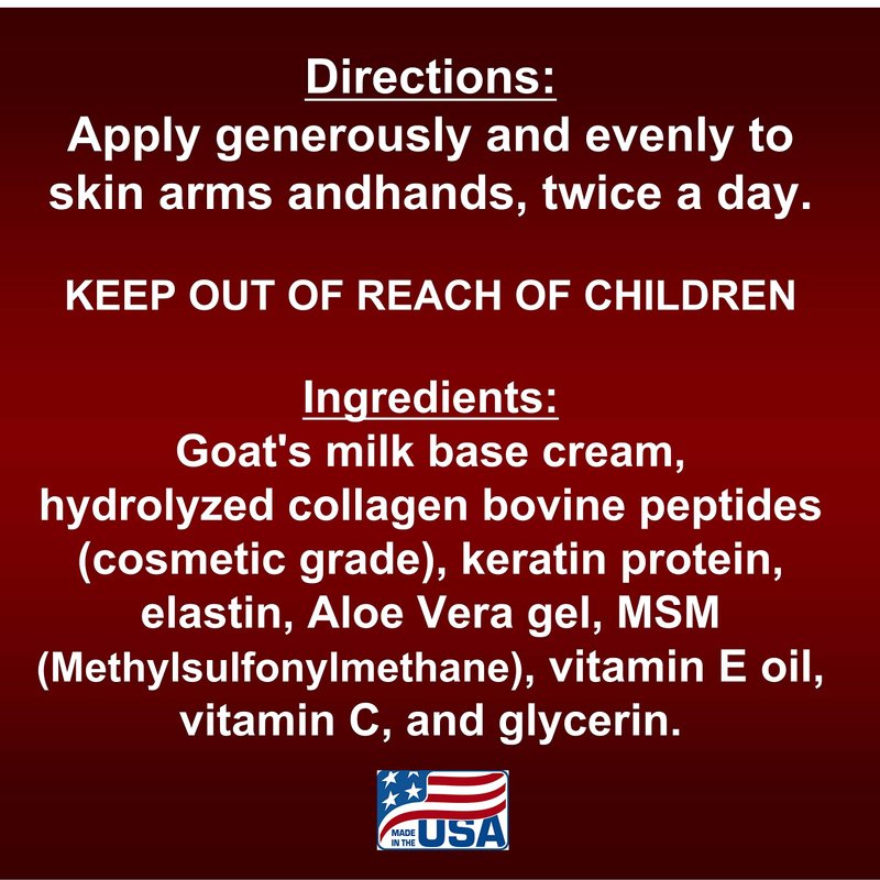 SKIN CREAM COLLAGEN - KERATIN - ELASTIN - VITAMIN C - MSM TOPICAL CREAM FOR THICKENING & FIRMING SAGGY FLABBY SKIN ARMS. DIRECTIONS: Apply generously and evenly to skin affected areas, twice a day. Apply it with clean fingers, close the lid tightly and store in a fresh place. JAR OF 4 FL OZ ( 120 ml ) AVOID CONTACT WITH EYES / INGREDIENTS: Goat's milk base cream, hydrolyzed collagen from bovine peptides (cosmetic grade), keratin protein, elastin, MSM, Aloe Vera gel, vitamin E oil, vitamin C, and glycerin. EXP: 2 Years after opened. Our products are made with the best quality ingredients, pure and original. /PRODUCT MADE IN USA