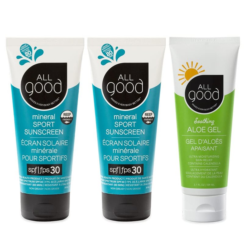 All Good Sport Mineral Sunscreen & Aloe Gel Bundle - UVA/UVB Broad Spectrum SPF 30+, Water Resistant - Includes (2) SPF 30 Sport Sunscreen and (1) Aloe Gel