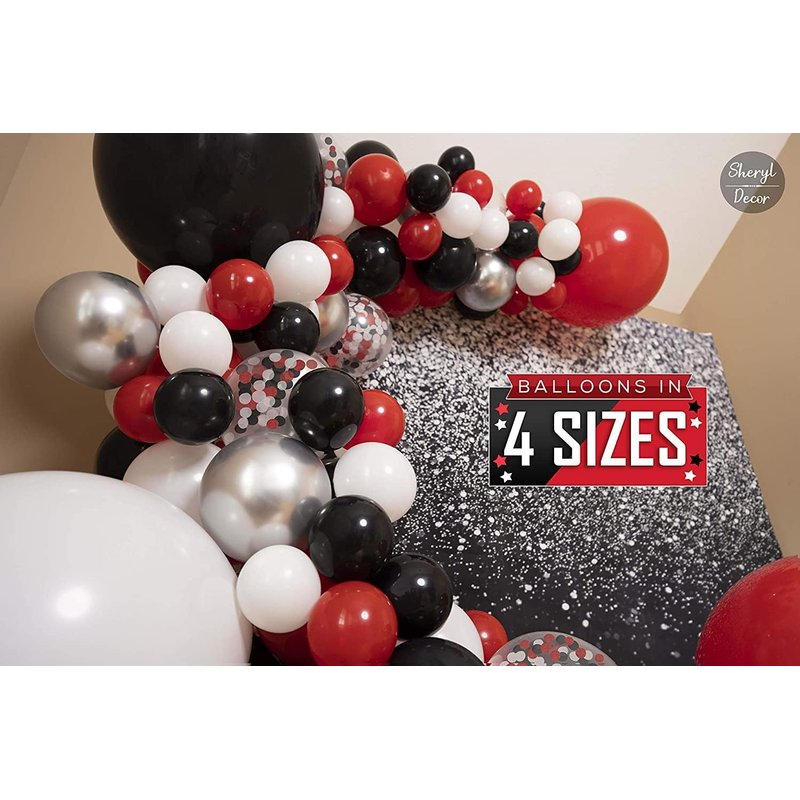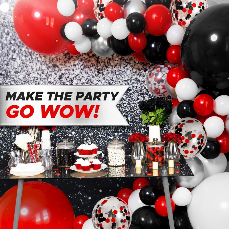 - 【BONUS CONFETTI BALLOONS!】Add that extra WOW factor by adding these MUST-HAVE black red white confetti balloons to your red white and black balloon garland kit. Your order also contains 30x small, 67x medium, and 3x large balloons. Each size contains various mixes of silver, confetti, white, red and black balloons. Be ready to receive compliment after compliment and everyone saying… “How CUTE!!”