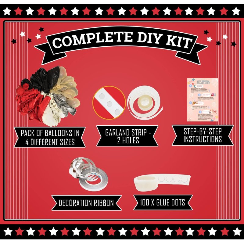 - 【EASY DIY】Along with all those hand-picked 100 black red and white balloons in 4 sizes, you get the following: beginner-friendly instructions, 100x glue dots, 16ft balloon garland strip, and 32ft tying ribbon to securely hang your red black and white balloon garland kit or each individual balloon. We make decorating for BUSY people fun & simple, whether it's for a black white red graduation or a red and black party decorations. Feel like an actual party planner and create YOUR own style!