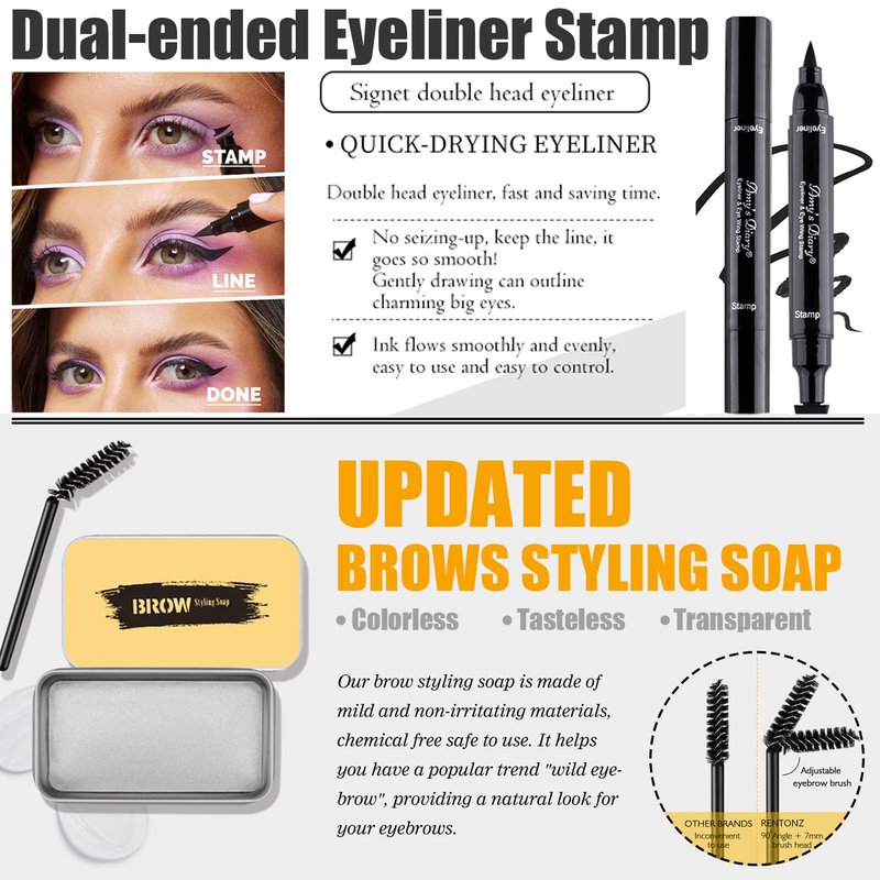 Our all in one Christmas makeup gift set including 12 colors naked shimmer eyeshadow palette, beige foundation, 3 pcs liquid lipsticks, eyebrow soap with brush, winged eyeliner stamp, waterproof mascara, makeup brush, 2 pcs makeup sponge. One set can meet all your needs for daily makeup!