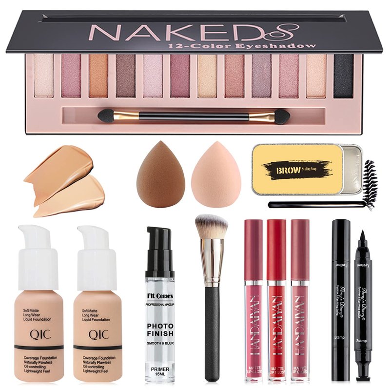 - ALL IN ONE MAKEUP KIT: The all-in-one starter makeup gift set including 12 colors shimmer eyeshadow palette, foundation, face primer, 3 pcs liquid lipsticks, eyebrow soap with brush, winged eyeliner stamp, waterproof mascara, makeup brush, 2 pcs makeup sponge. One set can meet all your needs for daily makeup!