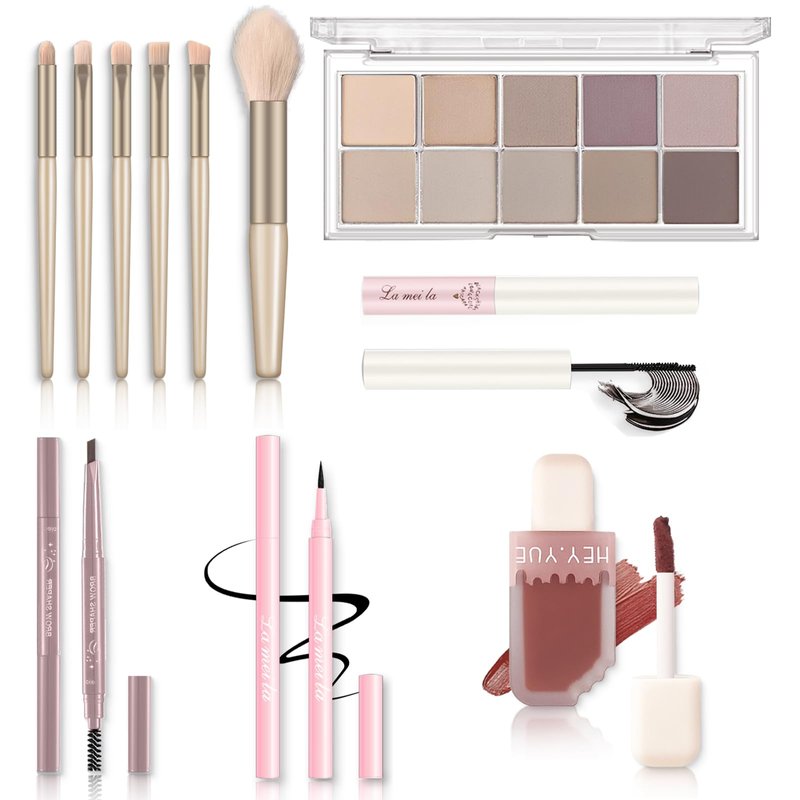 - 🍭【What's in the Makeup Set?】1 x 10 colors eyeshadow palette, 1 x waterproof and smudge-shield mascara, 1 x waterproof and smooth liquid eyeliner, 1 x brown eyebrow pencil, 1 x 6 pcs soft makeup brush set, 1 x lip gloss. Our eyeshadow palette's expertly curated shades are perfect for shading, highlighting, and defining eyes, brows, and the contours of the face.