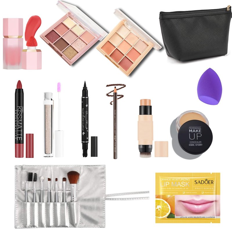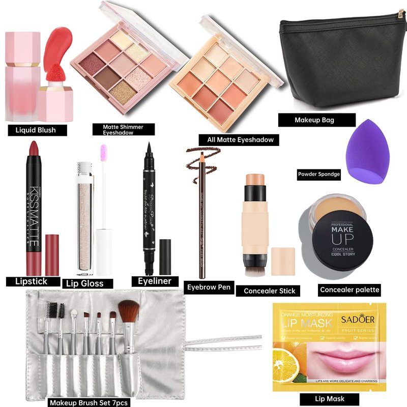 - Make up Kit Includes: 2 Eyeshadow palettes,1 lipstick, 7pcs makeup brushes set, 1 shiny lip gloss, 1 eyeliner, 1 eyebrown pen, 1 liquid blush,1 concealer palette,1 concealer stick, 1 powder sponge, 1 lip mask, coming with 1 makeup bag.