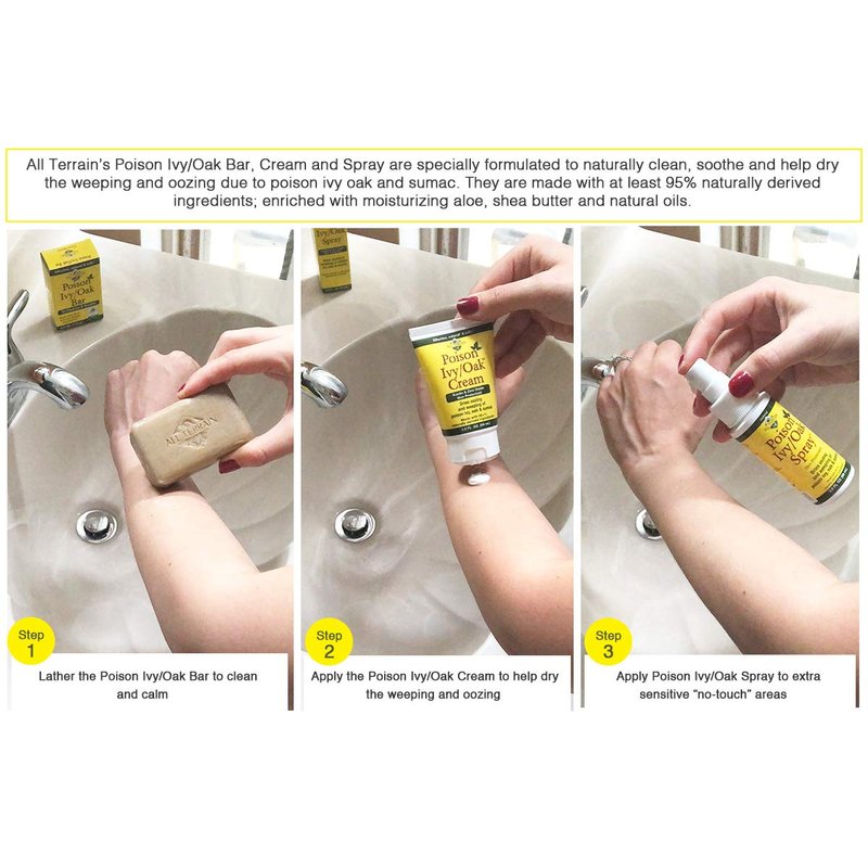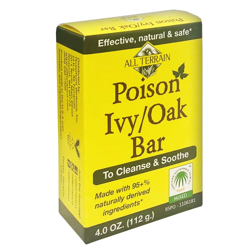 - BAR SOAP: All Terrain's Poison Ivy/Oak bar is a soothing soap to naturally cleanse & calm irritated skin. Formulated with nourishing oils & extracts such as tea tree, soybean, sunflower seed & Rainforest Alliance Certified palm oil.