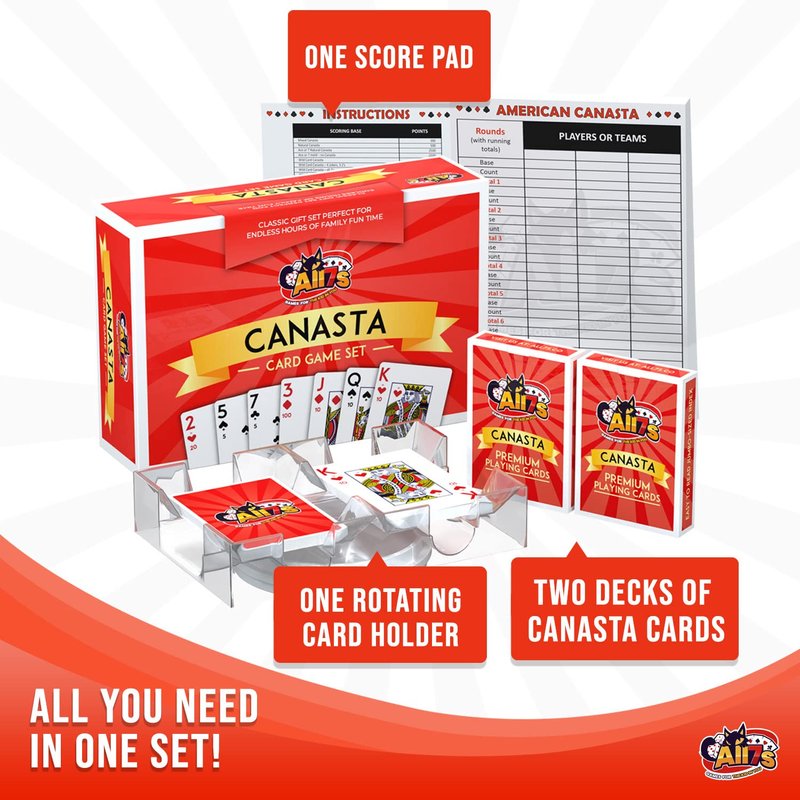 All7s Deluxe Canasta Cards Set with Point Values on Cards, Score Pads and Rotating Card Holder - Voted One of The Best Board Games for 2 People