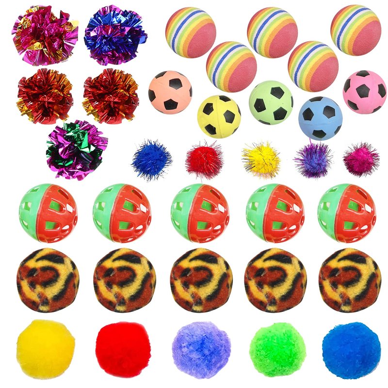 - Package includes: 35 PCS cat toys balls in 7 style (5 x rainbow balls, 5 x golden thread balls, 5 x pompoms balls, 5 x paper balls, 5 x small footballs, 5 x bell balls and 5 x leopard ball), sufficient quantity and different styles can meet the different needs of cats.