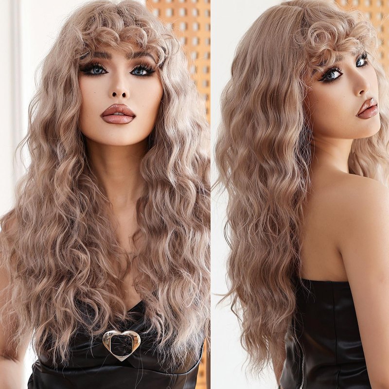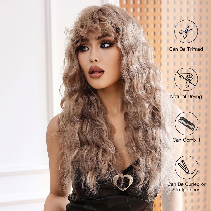 Allbell Long Blonde Curly Wigs for Women, Synthetic Wavy Wig with Cute Bangs, Long Blonde Wig Natural Looking Heat Resistant Fibre,Long Wavy Wig for Daily Party Use