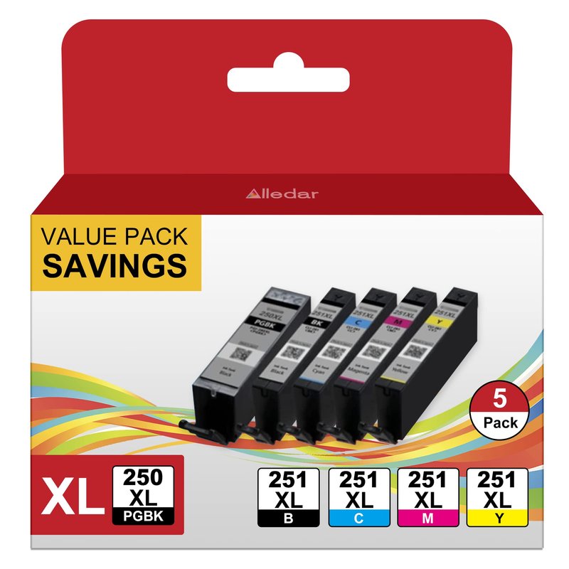 Value Pack: 5 packs of high yield canon printer ink 250 251, including 1 x 250XL PGBK, 1 x 251XL Black, 1 x 251XL Cyan, 1 x 251XL Magenta, 1 x 251XL Yellow