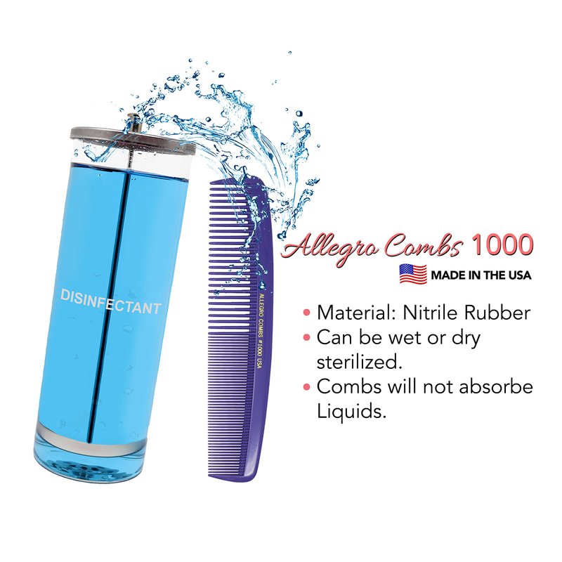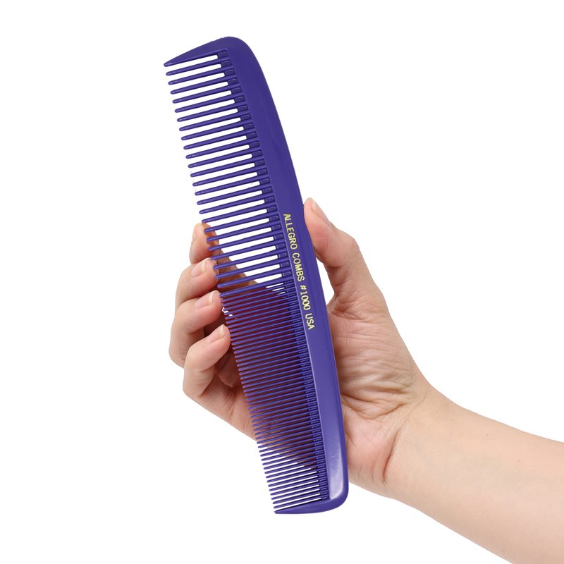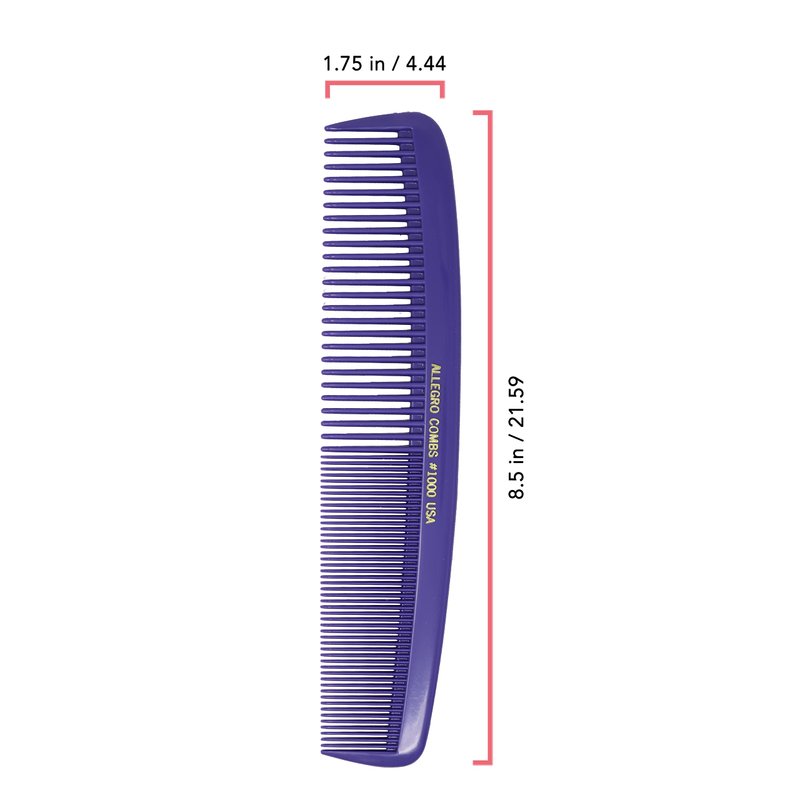 Measuring 8.25 inches in length, this comb is perfect for those with curly, wavy and straight hair. It's an excellent choice for anyone seeking a versatile large comb suitable for all hair types. Proudly made in the USA, this barber comb features rounded teeth in two distinct styles. The design not only ensures gentleness on your scalp but also makes it easy to handle, even for those with smaller hands. An all-purpose comb, it's adept at managing any hair type. Our extra-large styling and cutting combs come with smooth ends, ideal for hair parting and stitch braiding. The wide-toothed side serves as an excellent finishing comb. Whether you have thick or thin hair, the comb's wide and fine teeth will effortlessly detangle knots. Its parting teeth ensure each strand is combed through without getting ensnared. Crafted from a material that's a softer and more flexible alternative to hard rubber combs, its ultra-glossy, silky surface ensures smooth gliding through hair, allowing for efficient combing. The Allegro Combs #1000 is indispensable for both men and women. Its wide teeth effortlessly remove tangles and snarls, while the fine teeth on the flip side can be utilized for final touch-ups, eliminating any lingering knots and flyaways.