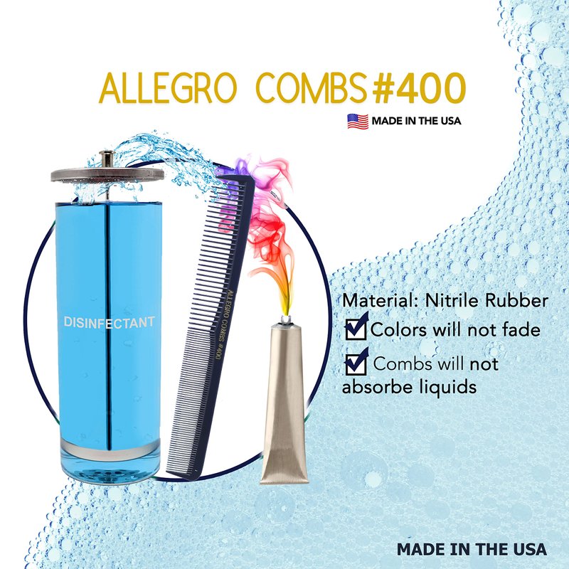 - DISINFECTABLE COMBS WILL NOT ABSORBE AND COLOR WILL NOT FADE IN BARBICIDE - These hair cutting combs 400 from Allegro Combs will not absorb sterilizing solutions, perms, conditioners, shampoos, oil, water, etc. These combs can be used for wet and dry hair cuts and in many hair styling situations. Colors in comb will NOT fade in disinfectants and other liquids