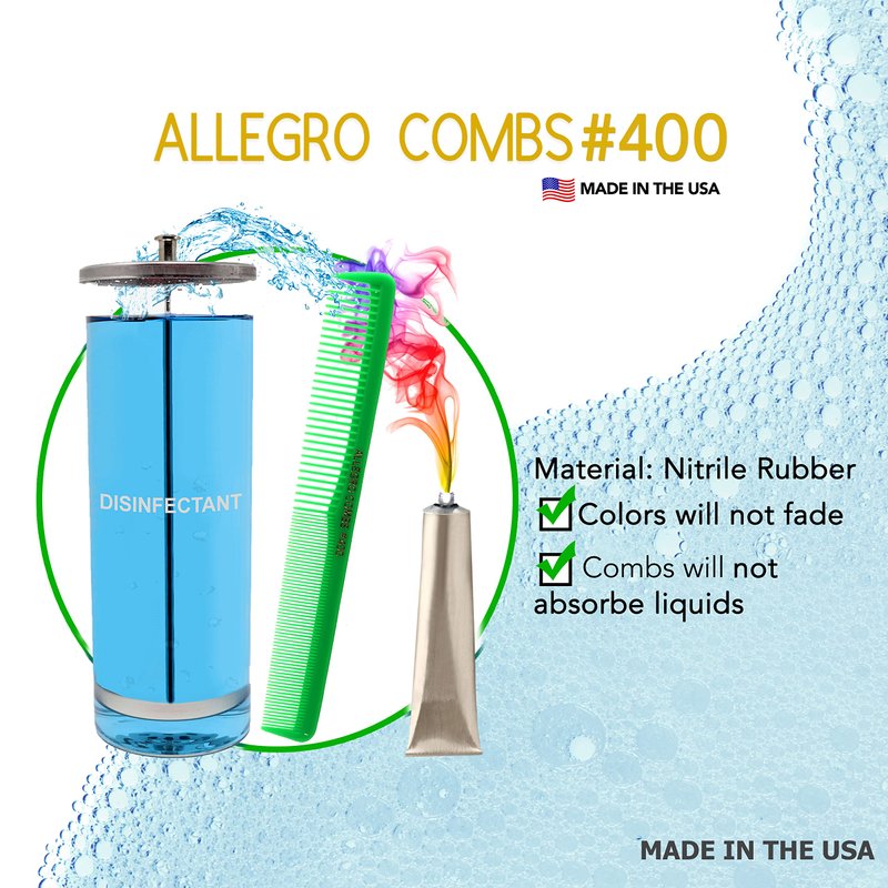 - DISINFECTABLE COMBS WILL NOT ABSORBE AND COLOR WILL NOT FADE IN BARBICIDE - These hair cutting combs 400 from Allegro Combs will not absorb sterilizing solutions, perms, conditioners, shampoos, oil, water, etc. These combs can be used for wet and dry hair cuts and in many hair styling situations. Colors in comb will NOT fade in disinfectants and other liquids