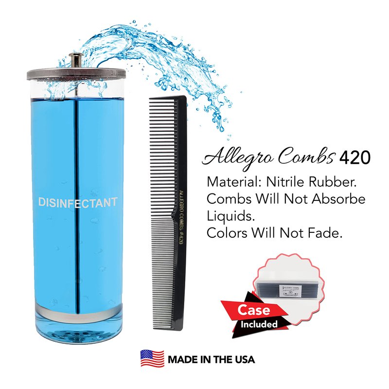 - DISINFECTABLE COMBS WILL NOT ABSORBE AND COLOR WILL NOT FADE IN BARBICIDE - These hair cutting combs model 420 from Allegro Combs will not absorb sterilizing solutions, perms, conditioners, shampoos, oil, water, etc. These combs can be used for wet and dry hair cuts and in many hair styling situations. Colors in comb will NOT fade in disinfectants and other liquids.