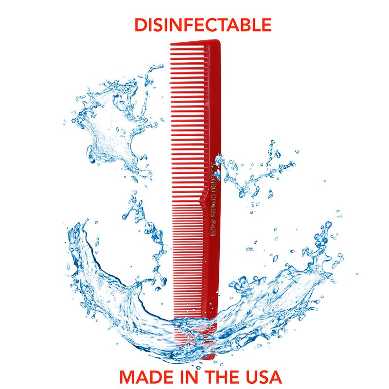 - DISINFECTABLE COMBS WILL NOT ABSORBE AND COLOR WILL NOT FADE IN BARBICIDE - These hair cutting combs model 420 from Allegro Combs will not absorb sterilizing solutions, perms, conditioners, shampoos, oil, water, etc. These combs can be used for wet and dry hair cuts and in many hair styling situations. Colors in comb will NOT fade in disinfectants and other liquids.