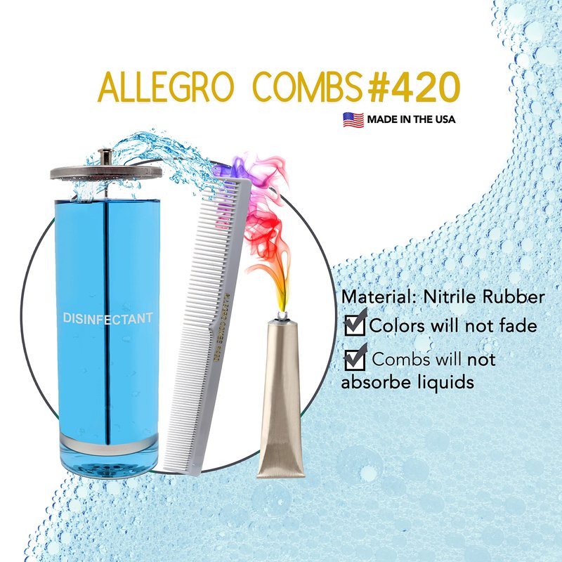 - DISINFECTABLE COMBS WILL NOT ABSORBE AND COLOR WILL NOT FADE IN BARBICIDE - These hair cutting combs model 420 from Allegro Combs will not absorb sterilizing solutions, perms, conditioners, shampoos, oil, water, etc. These combs can be used for wet and dry hair cuts and in many hair styling situations. Colors in comb will NOT fade in disinfectants and other liquids.