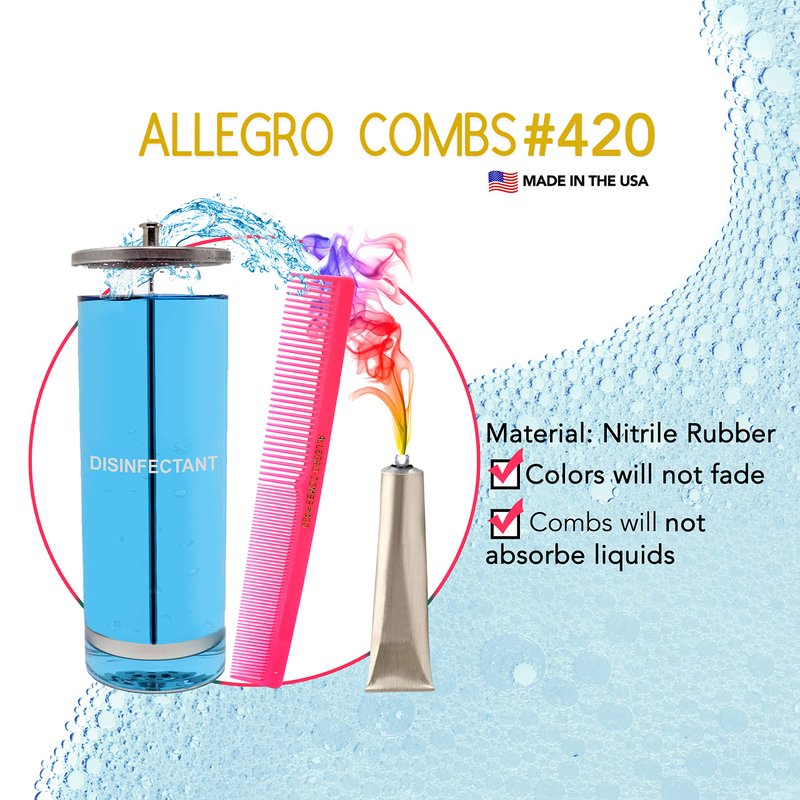 - DISINFECTABLE COMBS WILL NOT ABSORBE AND COLOR WILL NOT FADE IN BARBICIDE - These hair cutting combs model 420 from Allegro Combs will not absorb sterilizing solutions, perms, conditioners, shampoos, oil, water, etc. These combs can be used for wet and dry hair cuts and in many hair styling situations. Colors in comb will NOT fade in disinfectants and other liquids.
