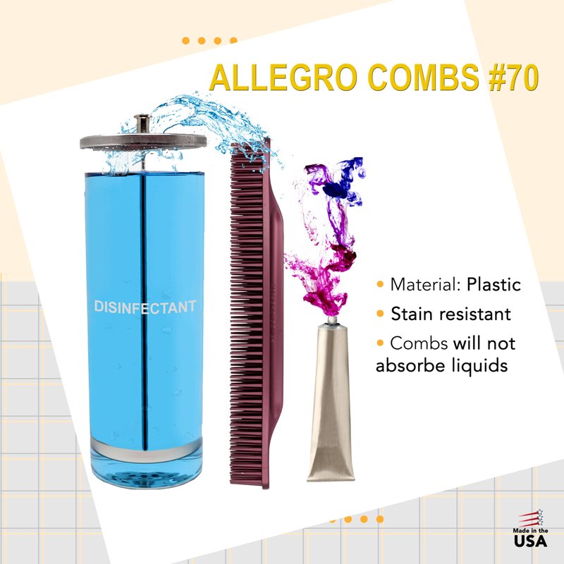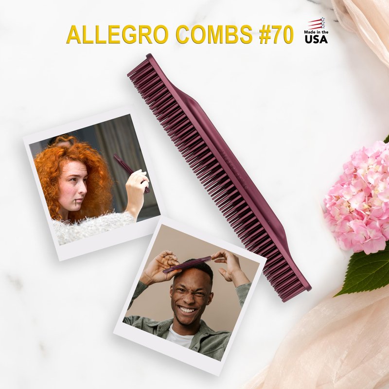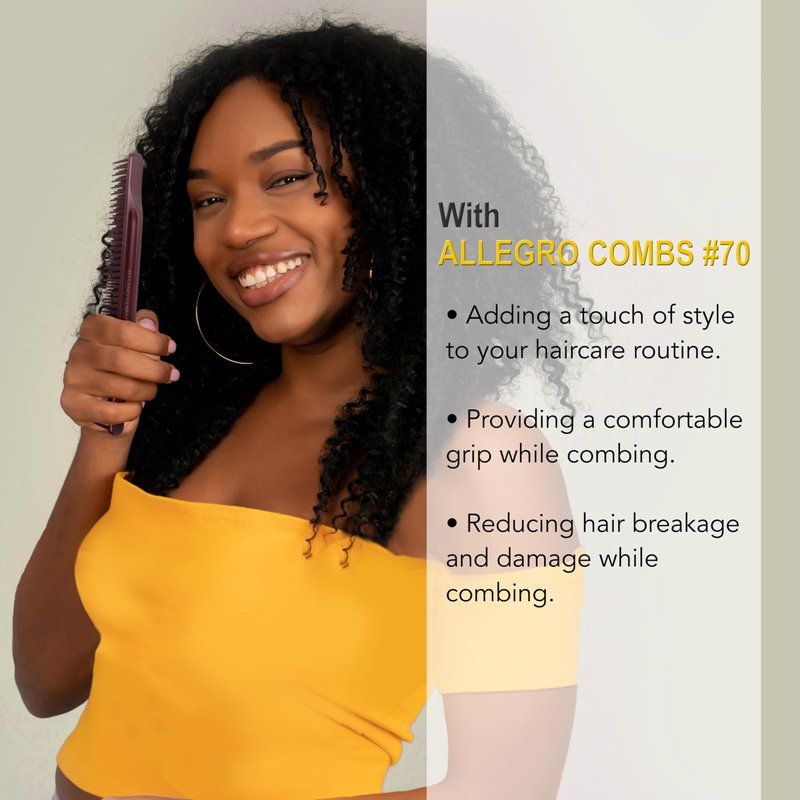 Allegro Combs #70 is a quality, 3-row comb designed to provide the ultimate detangling solution while enabling you to attain a salon-worthy look right at home. Proudly made in the USA. The comb's unique 3-row design makes it perfect for detangling and product application. Its wide-tooth design guarantees manageable, tangle-free hair, and its rounded teeth gently caress your scalp, minimizing hair breakage or damage. Additionally, the convex back design prevents product buildup, making cleaning straightforward. The Allegro Combs #70 is also resistant to staining and fading, retaining its vibrant color over time. Available in trendy, standout colors, this comb injects a dash of style into your haircare regimen. With its 7.80-inches length, it's travel-friendly and easily fits in your purse or bag. It's the perfect haircare gift for those who cherish their hair. More than a detangler, this comb is a versatile styling tool, perfect for parting, braiding, and crafting intricate hairstyles. It's ideal for thick and curly hair types. It's also designed to train your curls, making it a great choice for curly hair, barbershops, and all genders and ages. This hair comb is excellent for braiding, styling, and finishing, making it a versatile tool for all hair types. Its medium tension tooth comb is perfect for wet hair, while its wide tooth comb is ideal for wavy hair. Furthermore, the super wide tooth comb is perfect for fine hair. Its 3-row detangling comb feature facilitates easy hair detangling and styling, while its curling comb feature is perfect for curl training and styling. It's also great for shower use and is kid-friendly, thanks to its gentle touch on their delicate hair and scalp.