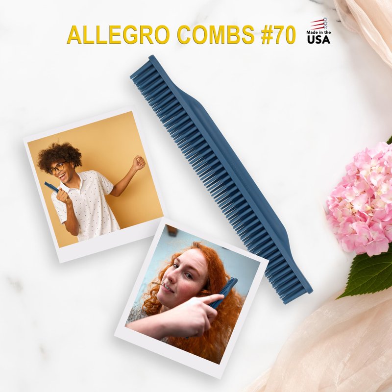 Allegro Combs #70 is a quality, 3-row comb designed to provide the ultimate detangling solution while enabling you to attain a salon-worthy look right at home. Proudly made in the USA. The comb's unique 3-row design makes it perfect for detangling and product application. Its wide-tooth design guarantees manageable, tangle-free hair, and its rounded teeth gently caress your scalp, minimizing hair breakage or damage. Additionally, the convex back design prevents product buildup, making cleaning straightforward. The Allegro Combs #70 is also resistant to staining and fading, retaining its vibrant color over time. Available in trendy, standout colors, this comb injects a dash of style into your haircare regimen. With its 7.80-inches length, it's travel-friendly and easily fits in your purse or bag. It's the perfect haircare gift for those who cherish their hair. More than a detangler, this comb is a versatile styling tool, perfect for parting, braiding, and crafting intricate hairstyles. It's ideal for thick and curly hair types. It's also designed to train your curls, making it a great choice for curly hair, barbershops, and all genders and ages. This hair comb is excellent for braiding, styling, and finishing, making it a versatile tool for all hair types. Its medium tension tooth comb is perfect for wet hair, while its wide tooth comb is ideal for wavy hair. Furthermore, the super wide tooth comb is perfect for fine hair. Its 3-row detangling comb feature facilitates easy hair detangling and styling, while its curling comb feature is perfect for curl training and styling. It's also great for shower use and is kid-friendly, thanks to its gentle touch on their delicate hair and scalp.