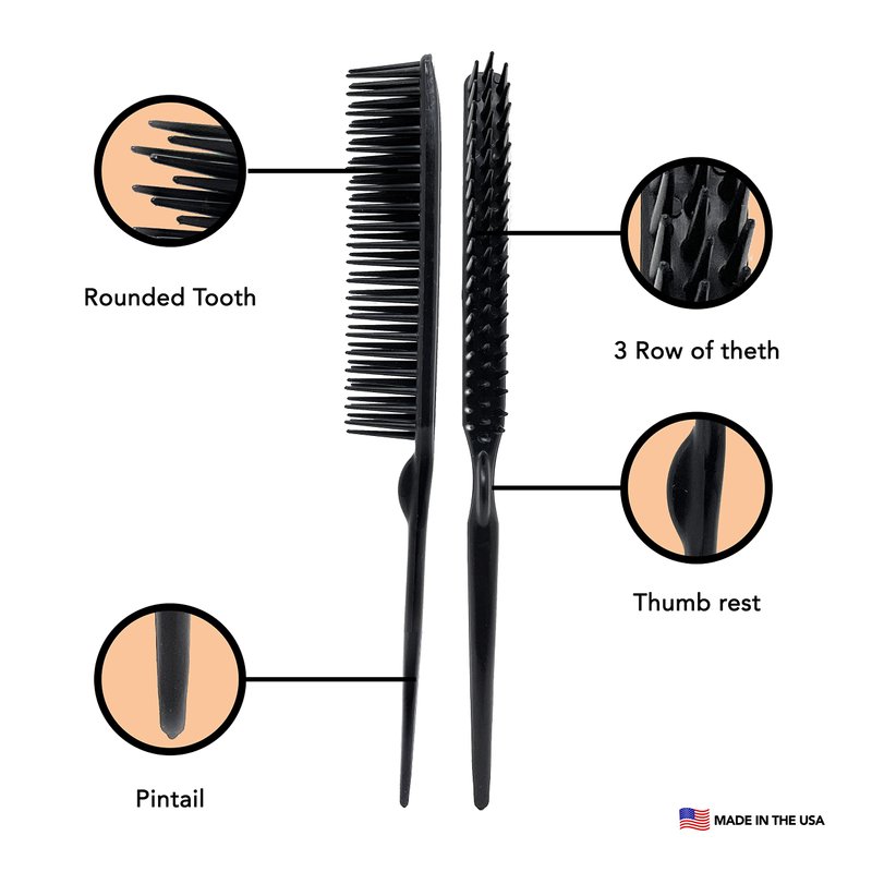 - THE THREE ROW COMB BRUSH WITH RATTAIL - 8 inches long for hair parting flexible body, curl defining brush smooth rounded tooth to penetrate the hair easily. Unbrush Detangling Brush. For applying hair products, since it doesn't absorbe liquids. Teasing combs for women blending brush. Combs for women Dimensions: 8 x 1 x 0.5 inches Made in The USA.