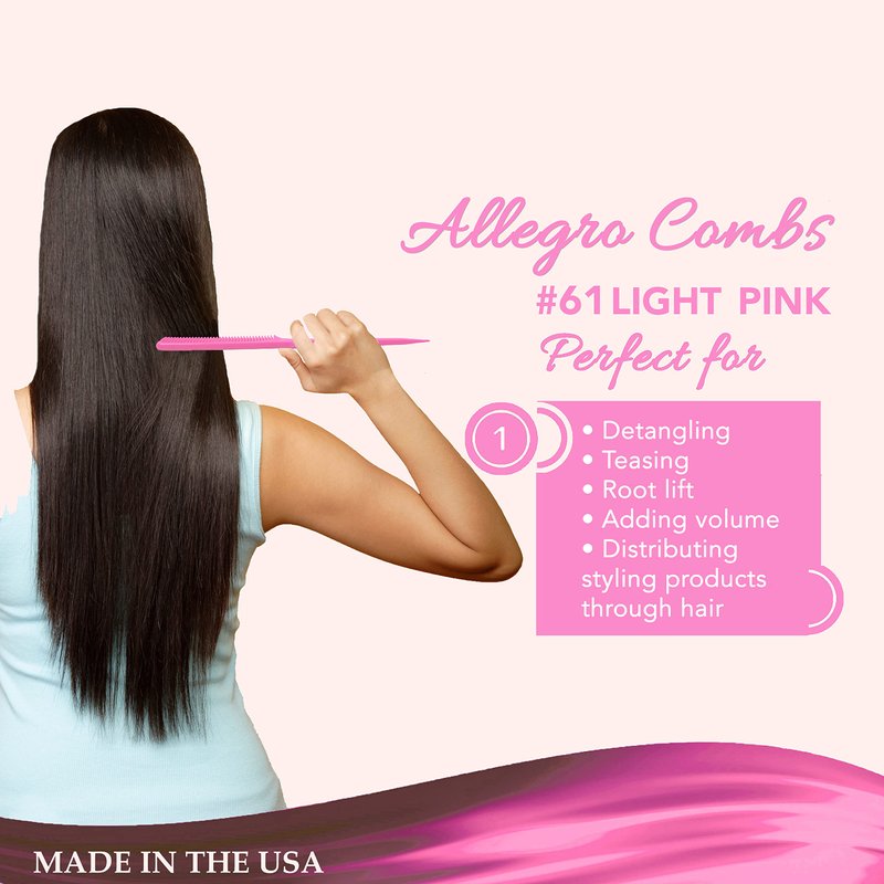 Allegro Combs#60 and #61professional rat tail combs for parting, teeth combs. These made in the USA braiding comb brush with rattail have a unique design and quality construction for lasting use. Made of high quality materials. Slick brush for hair women. These professional barber combs with bristle hair brush with rattail that has a unique design and quality construction for lasting use. Made in the USA of high quality materials. Wide tooth comb, makes it easy to care for all kinds of hair. Styling comb with rat tail shape wide tooth designed to provide precise trimming, smooth and drag free combing, allows for fast sectioning, separating and partings. Versatile hair combs. Wide tooth comb is great for women with wavy, frizz-prone hair to look for a smooth and sleek end look. Wide teeth comb great for straight hair or getting rid of any pesky little knots. Allegro Combs hair parting combs are a must have for any hair stylist and barber. These styling combs for men and woman are used to brush and style hair in between services, as well as when styling your own hair. Great combs for hair stylist. These handle combs are great for finishing styles that require precision work like braiding cornrows and twist outs. The unique design of these combs will easily glide through your clients’ tresses without snagging or pulling The Allegro Combs three row comb is a must have for every man's grooming kit. This parting combs for braiding hair is designed to evenly distribute oil and pomade to the hair, and it can be used as a pre-styling tool or as a finishing touch. The teeth spacing enables even distribution of styling product throughout the hair, while its rounded edges prevent damage caused by pulling and tugging. This combs features a handle that makes it easy to hold with thumb rest while you style your hair. Find the best color for you.