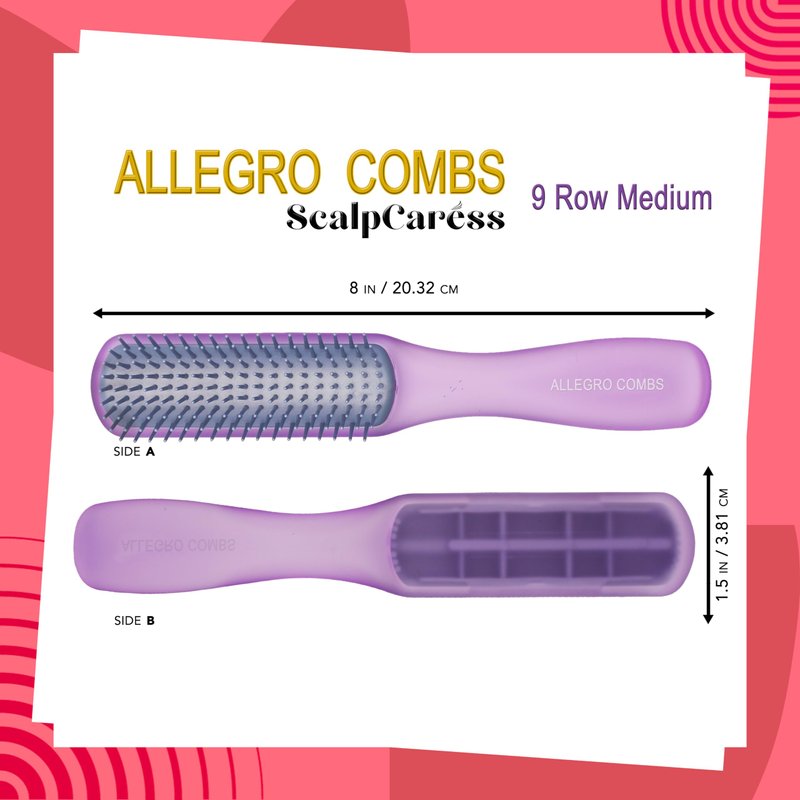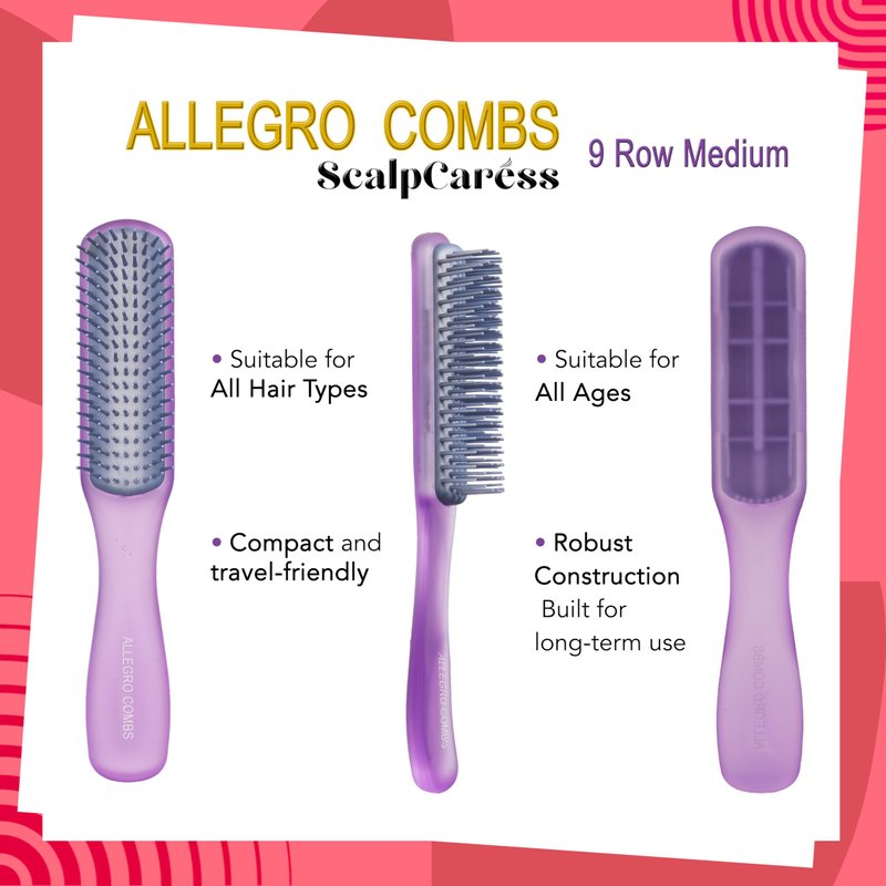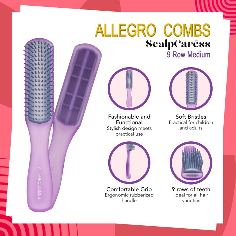 Discover the ultimate in hair care with the Allegro Combs ScalpCaress 9 row kids hair brush, a fusion of style and practicality crafted into an elegant and functional hair brush for curly hair. Womens hair brushes design for everyone, this tool caters to all hair types and styling needs. Its dimensions are a convenient 8.25 x 2.5 x 1.5 inches, making it an ideal size for womens hair brush both home use and travel brush. Built to last, the Allegro Combs ScalpCaress girls hair brush delivers durability and ease of maintenance. Travel brushes for hair with robust construction ensures it remains a steadfast part of your grooming collection for years. Soft bristle hair brush, Its versatility shines, effortlessly handling any hair type, from short hair, thin hair, and frizzy hair to long hair, wet hair, and dry hair. It excels in smoothing, detangling hair, and providing a soothing scalp massage, transforming your grooming routine into a great experience. The smoothing hair brush's ergonomic design delivers a maximum comfort during use. Say goodbye to pulling and snagging – the Allegro Coms ScalpCaress hairbrush for thick hair is engineered to glide through your hair with ease. Its smooth, rubberized handle provides enhanced control and comfort, making it suitable for users of all ages, from children to adults. Beyond its functional prowess, the Allegro Combs ScalpCaress 9 row untangle hair brush is a vibrant addition to your styling toolkit. This hair brush men is available in various trendy colors, it brings a lively touch to your daily hair care routine. Its chic design also makes it a thoughtful gift for children and friends, fitting for any special occasion. This detangler hair brush is an all-rounder, whether you need a detangler for curly hair, a soft bristle brush for sensitive scalps, or a reliable option for quick styling. It's perfectly suited as a women's hair brush, a gentle toddler brush, or a robust men's brush. Its compact design delivers it fits seamlessly into any bag or pocket, making it an excellent travel companion. Embrace a new level of hair care with the Allegro Combs ScalpCaress 9 Row mens brush.