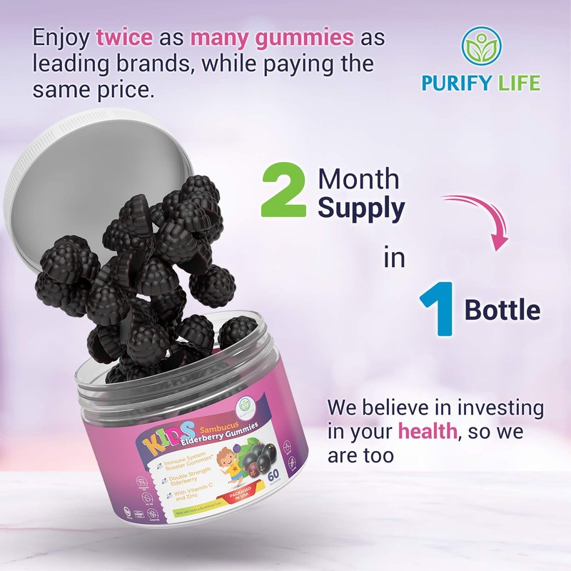 - [Extended Supply for Long-lasting Immune Support] – Each jar of our Purify Life sambucus elderberry gummies for kids brims with 60 servings, ensuring a continuous 2-month supply. This means your child gets sustained immune support, making our offering twice as beneficial as other leading brands on the market.