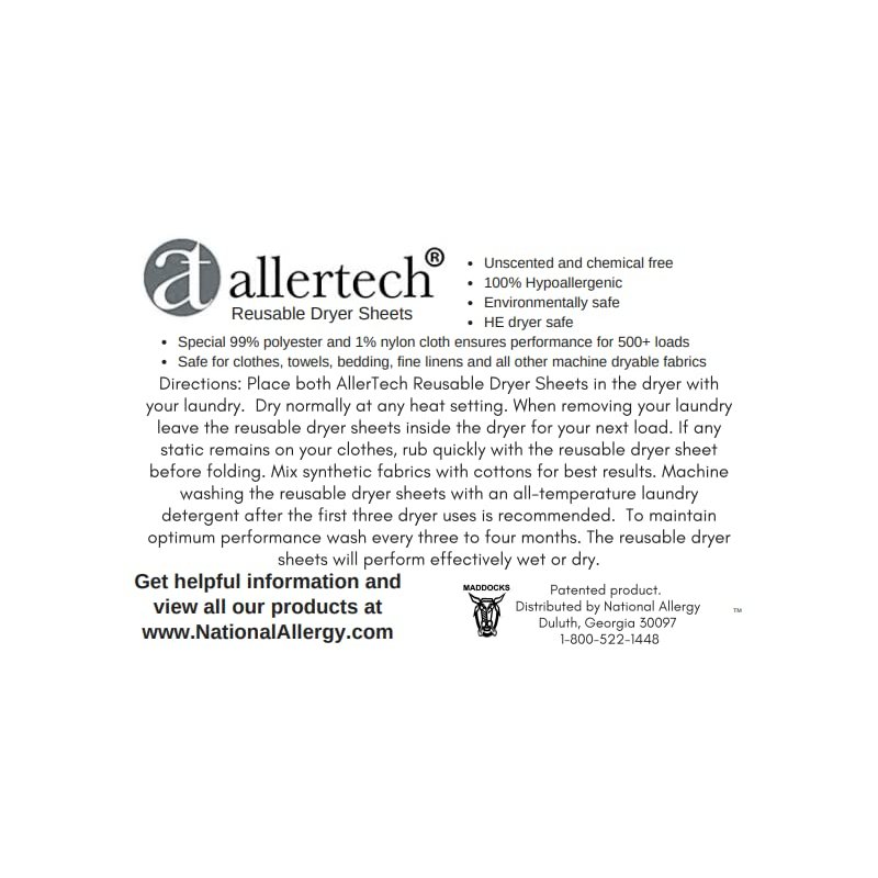 AllerTech Reusable Dryer Sheets help naturally release wrinkles and reduce static cling without perfumes, dyes, fragrances, or common chemical irritants. Made from 99% polyester and 1% nylon fabric which naturally draws static and wrinkles from your clothing! Package contains (2) fabric 7.5" x 12" unscented dryer sheets. Directions: Place both AllerTech Reusable Dryer Sheets in the dryer with your laundry. Dry normally at any heat setting. When removing your laundry leave the reusable dryer sheets inside the dryer for the next load. If any static remains on your clothes, rub quickly with the reusable dryer sheet before folding. Machine wash the reusable dryer sheets with an all-temperature laundry detergent after the first three dryer uses is recommended. To maintain optimum performance machine wash every 3 months. The reusable dryer sheets will perform effectively wet or dry.