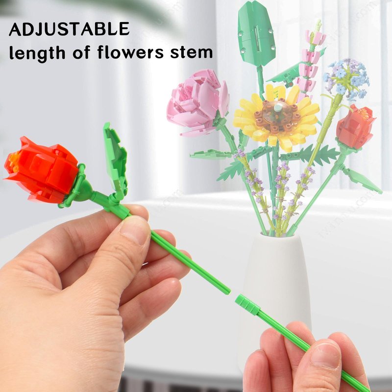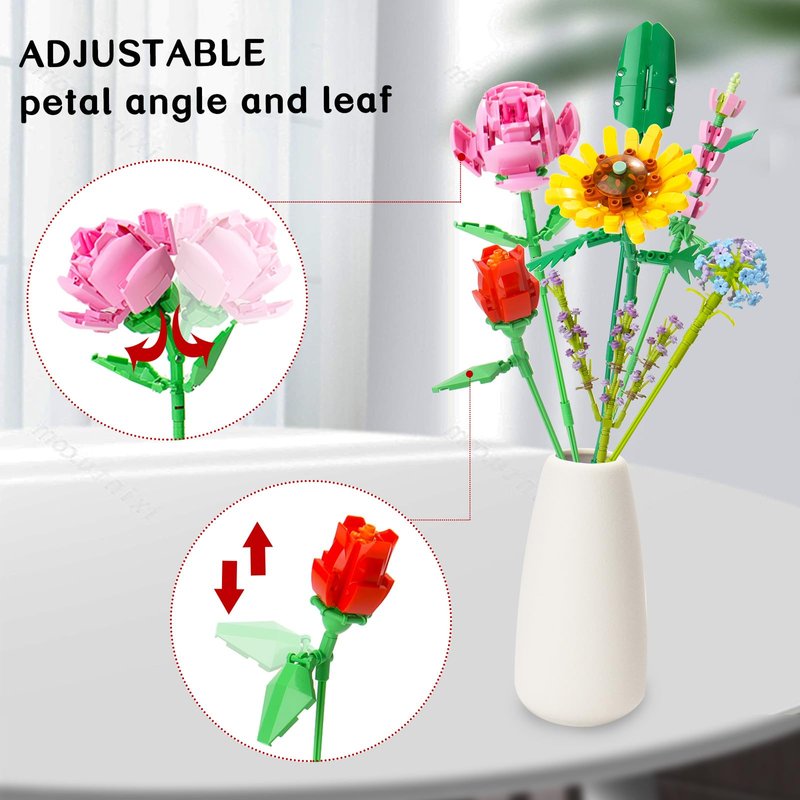 - ADJUST THE PETALS AND LEAVES TO CREATE DIFFERENT LOOK The angle of flower petal and leaves can be adjustable, the length of flower stems can be adjustable, by adjusting the petal's and leave's angle to create your preferred look and your own flower bouquet building kit.