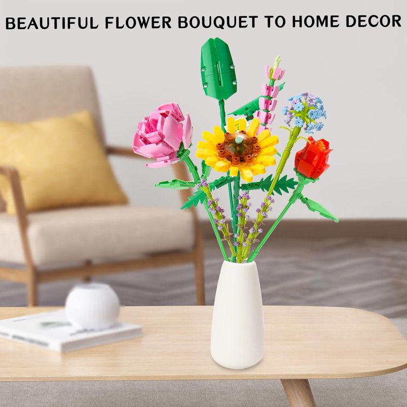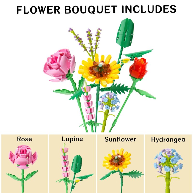 - COLORFUL FLOWER BOUQUET BUILDING SET FOR DECORATION The flower bouquet building set contains blue lotus, streliteela, sunflower, Buddleia etc., the colors are really vivid and the entire design looks super attractive wherever is it placed, look colorful and stunning, it's a great addition to display in your room, office bedroom living room etc.