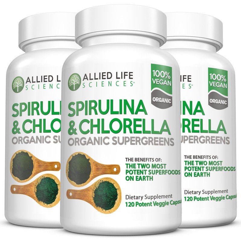 Allied Life Spirulina and Chlorella | Organic Chlorophyll Vegan Protein Powder Green Superfood Capsules | Natural Immune Support (3 Bottle Pack)