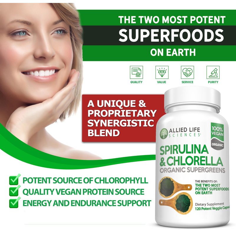 - Allied Life’s unique and proprietary combination of spirulina and broken cell wall chlorella creates synergies and benefits that taking only one by itself cannot equal. It is scientifically combined in the correct ratios to maximize benefits into one potent nutritional supplement.