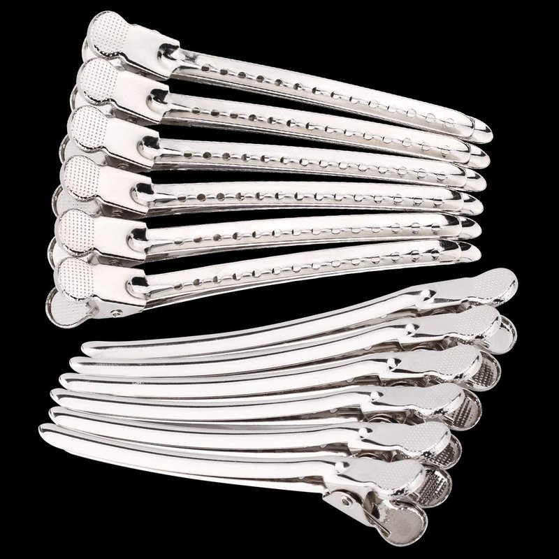 Metal Alligator Hair Clips for Hair Styling Hair Clip DIY (Silver)Features: - Alligator clips for hair are made of anodized aluminum to ensure durability for a long-term application.- These metal hair clips can easily hold your hair when cutting, styling or blow-drying.- The spring with good elasticity help to hold a large amount of hair, but no hard to open.- These hair pins are helpful for you to make beautiful hairstyles; also can be applied as a great gift for your friends and family members.Note: you can section off hair with these duck clips for styling when using hot tools such as curling wands or flat irons; And to make retro pin curls, you can use a rat-tail comb to create a deep side part with semi-damp hair1. Medium-sized curls: you'd better grab 1 inch section of hair.2. Bigger curls: you'd better grab a larger section of hair.3. Easy to make curls: starting from the ends of hair, rolling up sections clockwise around finger, and secure clips in place as close to scalp as possible.Color: SilverMaterial: MetalSize: Alligator Sectioning Hair Clips Long 9cm; easy to carry; Quantity: 12pcsPackage Contents: 12 x Sectioning ClipsIf you are satisfied with our products, please press the " Add to Cart " button and buy our Duck Bill Hair Clips.