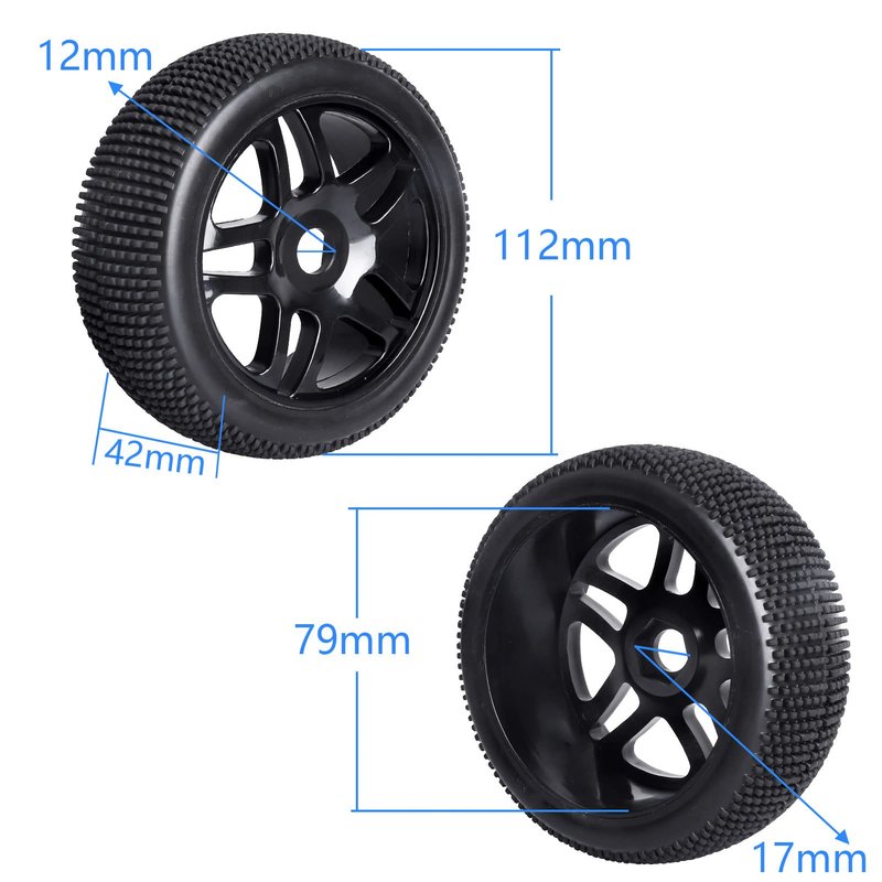 - Tires Outer Diameter: 4.4" (112mm) | Width: 4.65" (42mm) ; Wheel Rims Inner Diameter: 3.11" (79mm) | Hex Size: 17mm | Axle Hole: 12mm.
