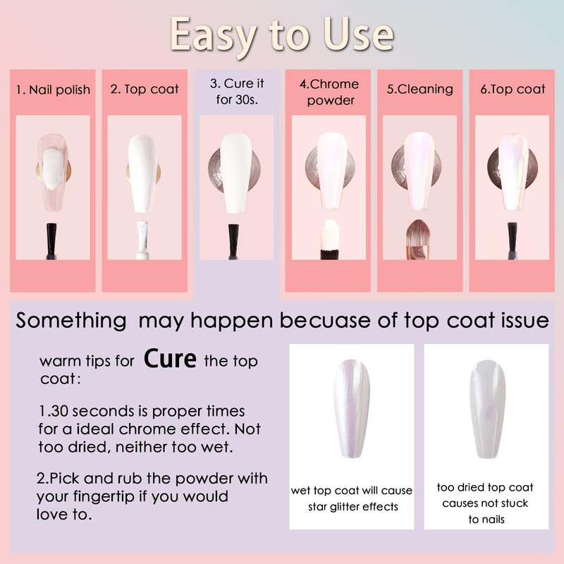 - 【Easy to Use】Rubbing the chrome nail powder to the regular nail tip after applied no-wipe top coat gel polish with a sponge applicator, then you can see that the gel nail polish chrome powder become chrome shine sticking on the nail. The chrome pigment powder for nails are friendly to starters and nail techs. We provide usage, warm tips, and some nail designs in the images.