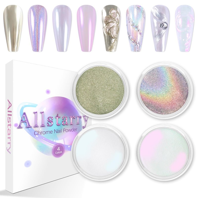- 【Perfect for Nail DIY】Allstarry chrome nail powder metallic mirror effect pigment and glazed donut nails chrome powder are functional to nail DIY at home or salon. The pearl chrome powder are suitable for crafting chrome full nails, chrome French nails, chrome powder bubble nails, and marble nails. And you can apply nail decorations, such as ail art rhinestones, nail glitter, nail decals, nail charms on chrome nails to meet nail designs for Halloween, Christmas, Valentine day, raves, etc.