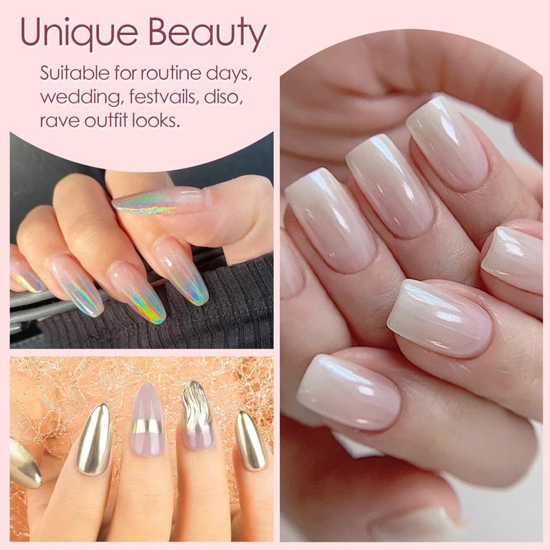 - 【All-in-one Kit】 We collect four different effects chrome nail powders, including white pearl chrome nail powder, purple aurora chrome nail powder, and champagne mirror chrome nail powder, the silver holographic chrome nail powder. These 4Pcs chrome finish nail powder can meet all your need for pearlescent nails, mermaid chrome nail, unicorn chrome nails, glazed donut nail, metallic mirror nail, and laser holographic glitter nails.