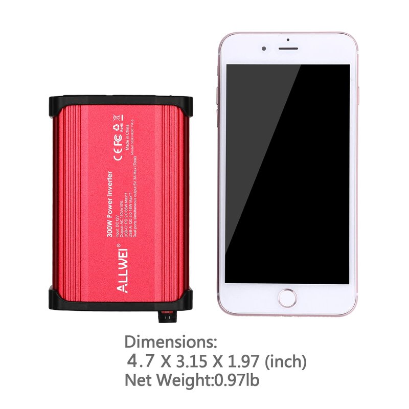 ALLWEI 300W Car AC Power Inverter DC 12V to 110V for Vehicles Converter USB-C PD65W/18W USB Fast Charging Ports Car Charger Adapter (Red)