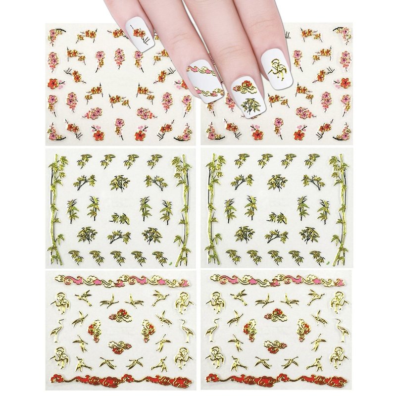 - INCLUDES: Cherry Blossom Nail Stickers (2 sheets), Bamboo Nail Stickers (2 sheets) & Crane Bird Nail Stickers (2 sheets); 6 sheets of nail stickers total