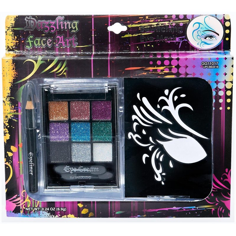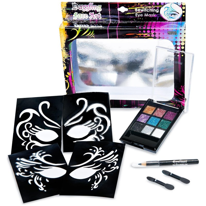 The Glitter Eyeshadow and Stencil Kit includes pallet with 9 eyeshadow colors, applicator, eyeliner and two stencils. Halloween only comes around once a year so take advantage of it with costumes, props and accessories sold here at at great price.