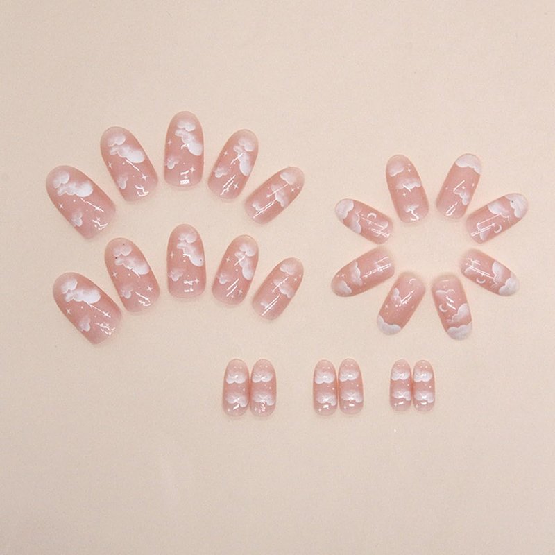 Almond Press on Nails Medium Fake Nails White Clouds Acrylic False Nails Press Ons WIth Stars Moon Designs Full Cover Glue on Nails Stick on Nails for Women Girls Manicure Art 24 Pcs